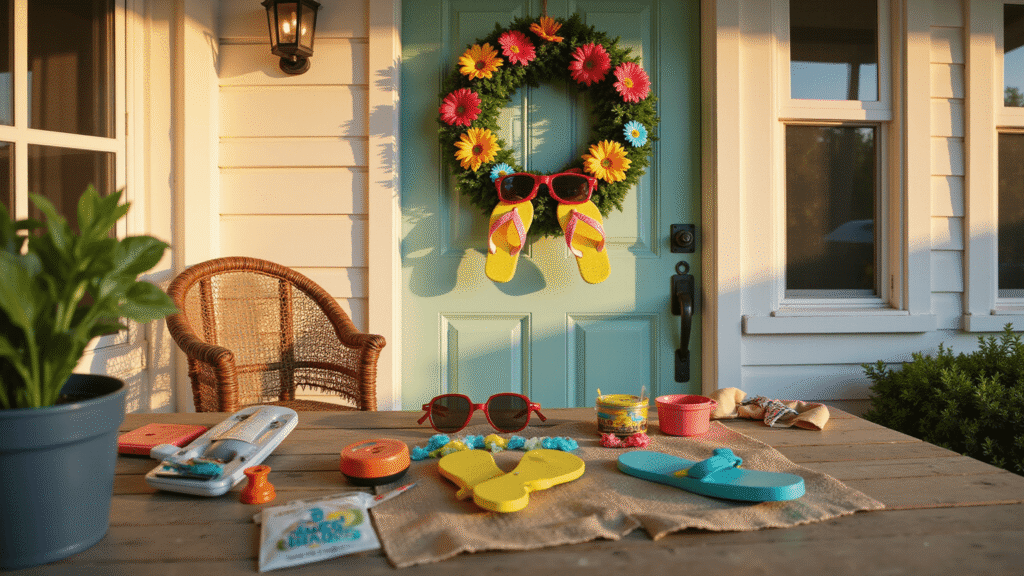Photorealistic front porch at golden hour featuring a tropical summer wreath adorned with rainbow flip-flops and Hawaiian leis on a sage green door, casting warm shadows on whitewashed siding with wicker furniture in the background; close-up of a rustic table with a hot glue gun and colorful craft supplies, emphasizing inviting summer crafting mood.
