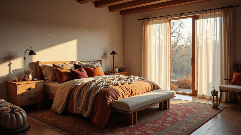 Keywords: fall bedroom decor, cozy home styling, autumn interior design, seasonal room makeover, textural decor