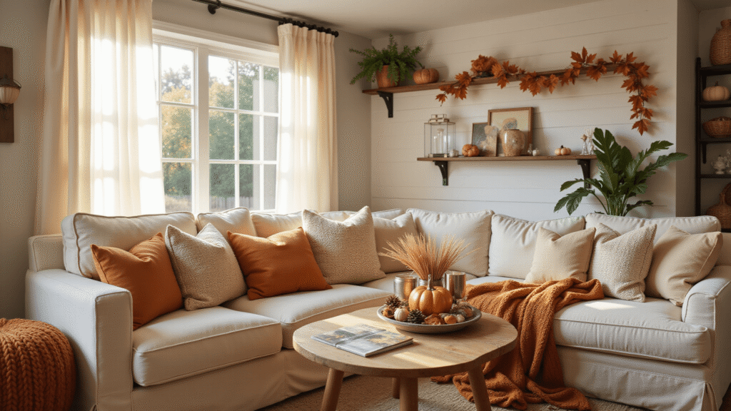 Cinematic living room in warm autumn hues featuring a cream sectional sofa with textured pillows, rustic wooden coffee table with DIY pumpkin centerpiece, shiplap walls, and cozy decor elements like chunky knit throws and a leaf garland.