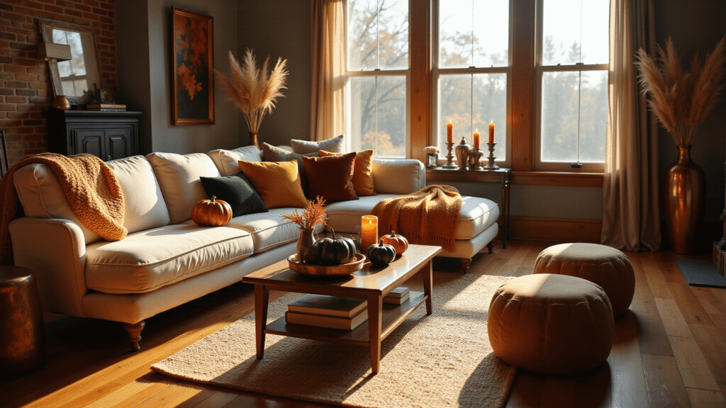 A luxurious fall living room featuring a cream sectional sofa with autumn textiles, a mahogany coffee table adorned with ceramic pumpkins and candles, rich hardwood floors, and an exposed brick wall, all bathed in warm, golden hour sunlight.