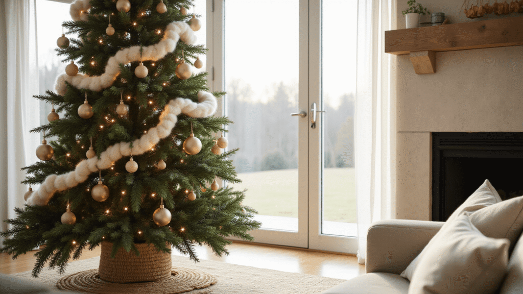 Photorealistic interior of a modern living room featuring a 9-foot artificial Christmas tree decorated in a neutral palette, with warm white lights, surrounded by textured throw pillows, and soft shadows from morning light filtering through sheer curtains.